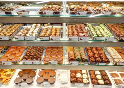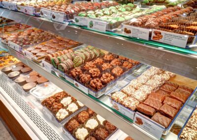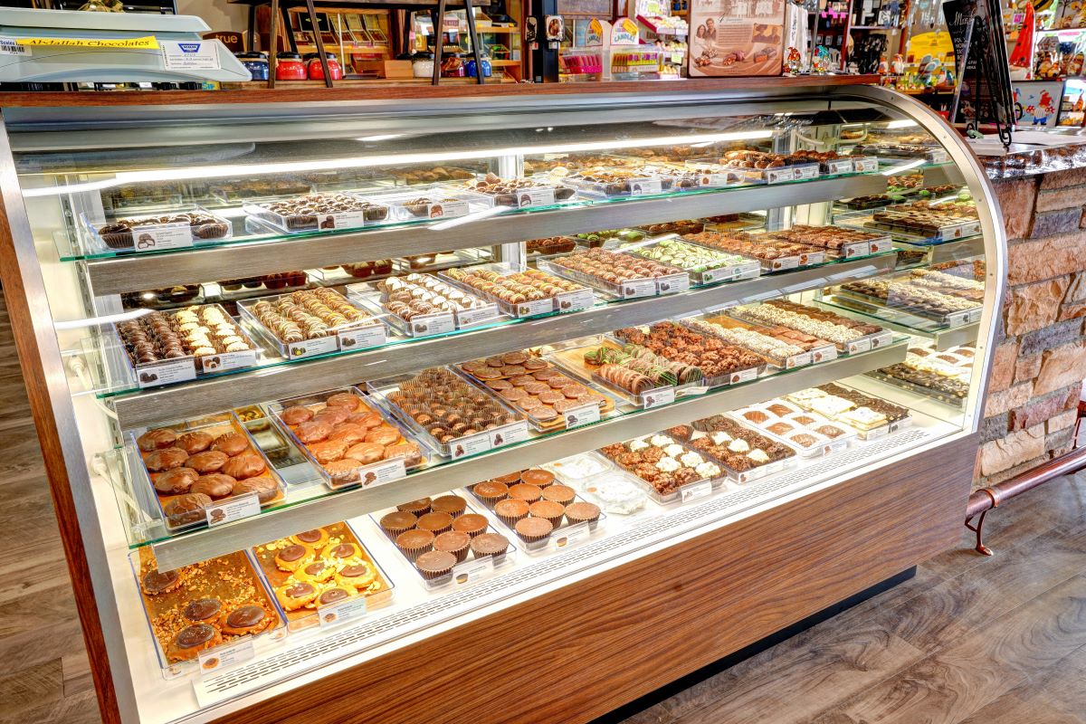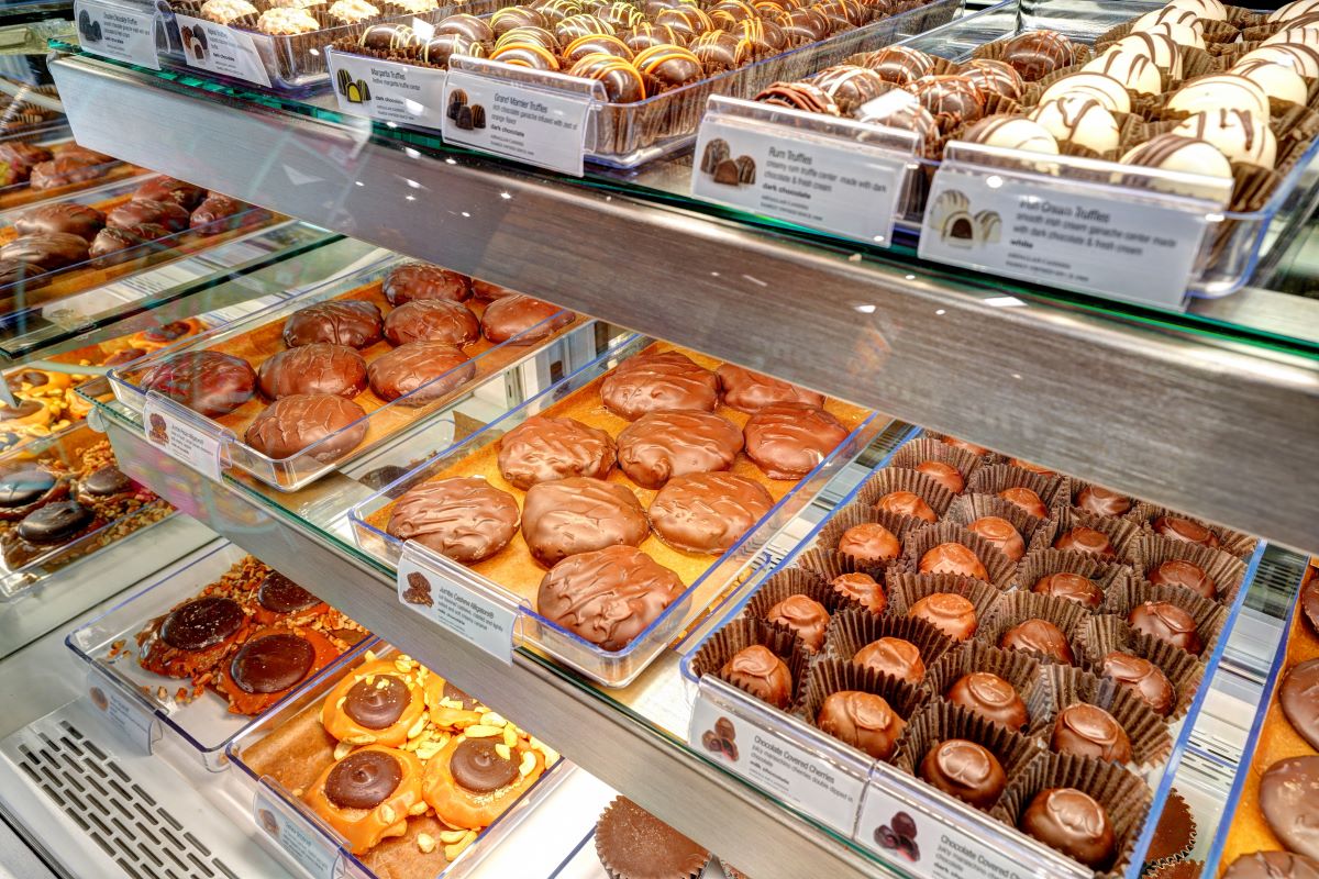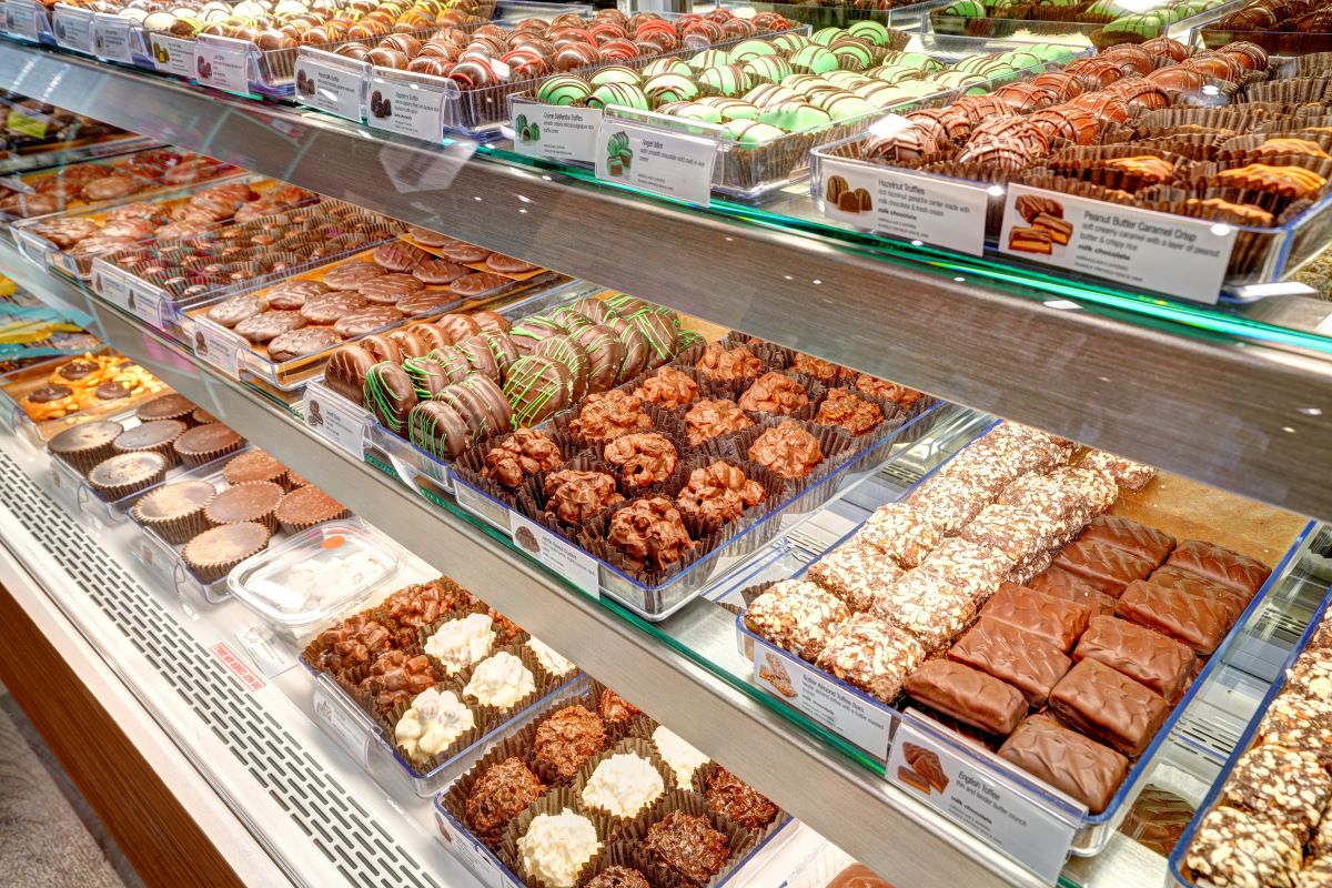 Chocolate Bar - case with trays - closeup - all kind of gourmet chocolate from large peanut butter cups, to truffles, turtles, and more.